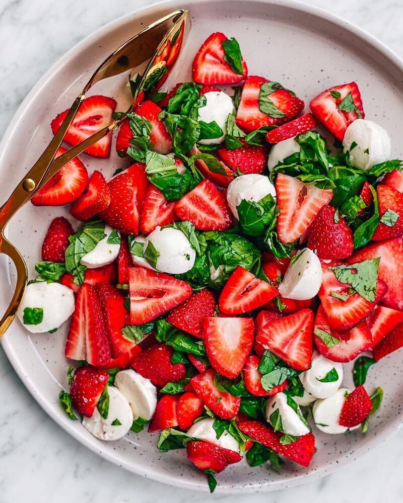 - Arrange strawberries, mozzarella, and basil on a platter.