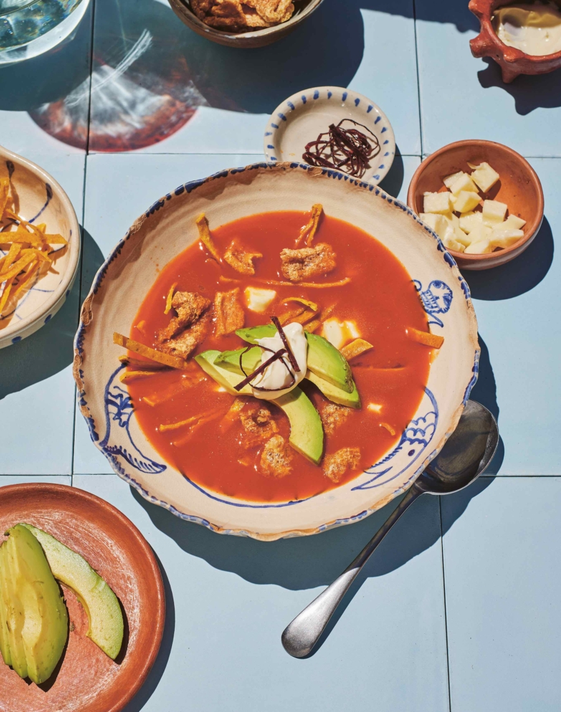 Serve the soup in a large bowl. Each person can add whichever garnishes they want. I recommend: a handful of tortilla strips, cheese, avocado, chicharrón, a drizzle of cream, then the fried chilli. Keep adding more as you eat.